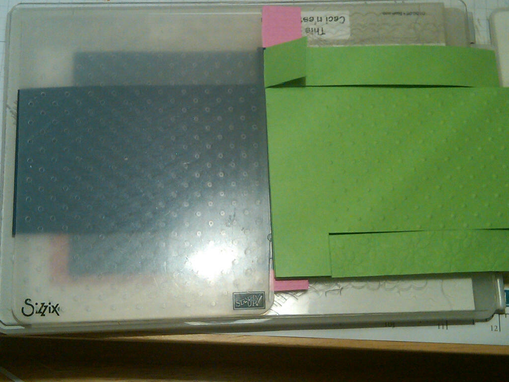 Take your second Embossing Folder, I used Perfect Polka Dots, and place your center panel inside of it extending it fully across both side panels. Yes, this will flattened the embossing on your side panels a little but trust me when I say it makes for a very nice "subtle" embossed pattern and it also allows for your center panel to really be your focal point. You're going to need to add some shims to the bottom portion of your card. Ok, technically you don't but I found if when I didn't, and the card was "standing open" you could see the embossing was "bolder" in the very bottom of the side panels. It was just enough to bother me. If it doesn't bother you, no worries, if it does this is how I fixed it.